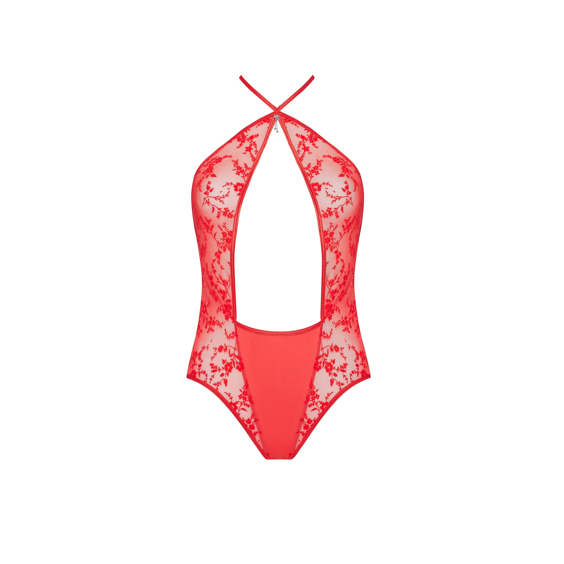 Seductive teddy made from soft tulle with a floral motif. Intense red and exposed breasts and belly attract attention. Neckline decorated with a silver application. Teddy fastened with hooks at the crotch.