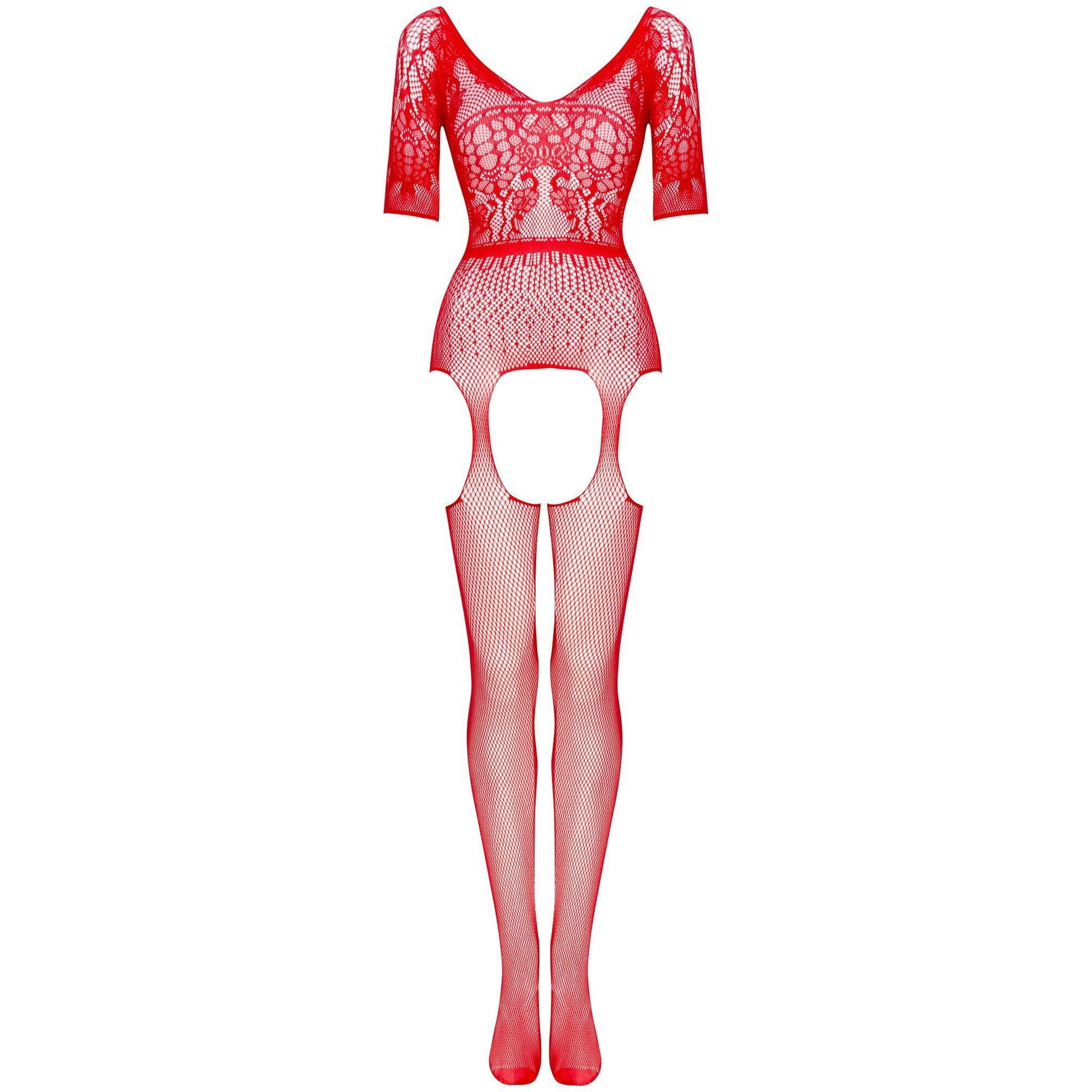 Super sexy catsuit for lovers of comfortable underwear, made from red, delicate yarn. The upper part is a sexy short-sleeved T-shirt decorated by floral applications and a belt emphasizing the waist. The lower part is classic stockings. Courtney Red bodystocking is the perfect choice for women who want to feel sensual and confident. It is also an excellent gift option for men who want to give their partner something special. Perfect craftsmanship and high-quality materials ensure comfort and elegance. The vibrant red color adds a bold and provocative touch, symbolizing passion and desire.