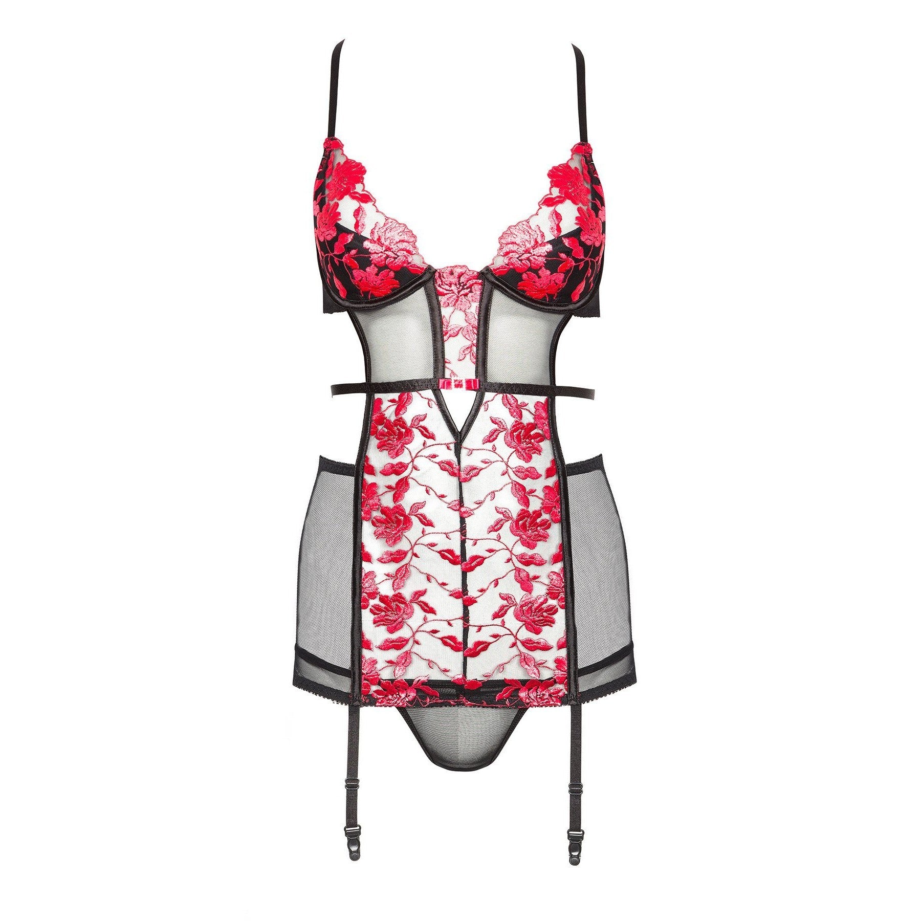 Crafted from delicate mesh and adorned with intricate red embroidery, this chemise features: