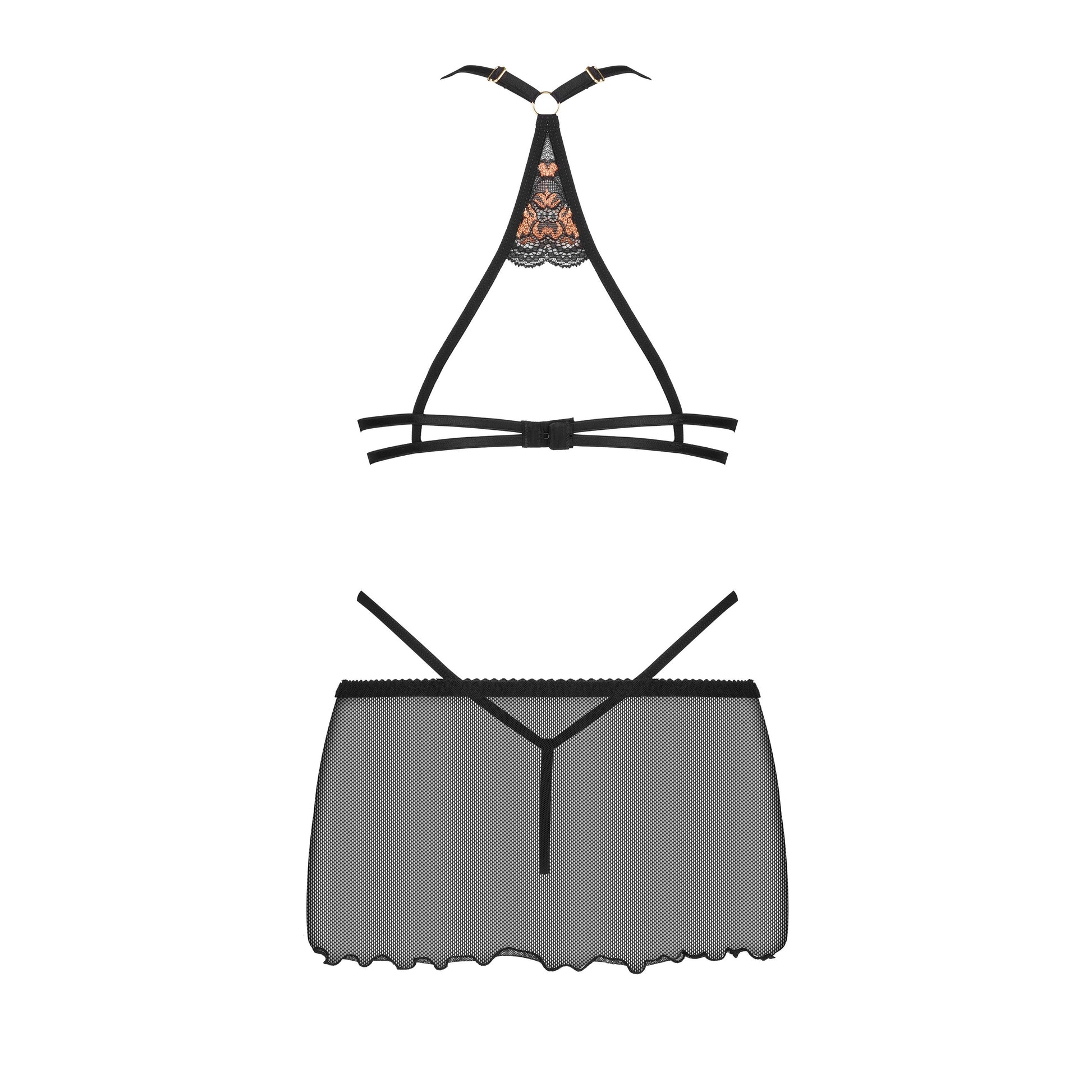 A classic, sexy, black chemise made of tulle and lace with a copper accent. The triangular cups beautifully highlight the bust.