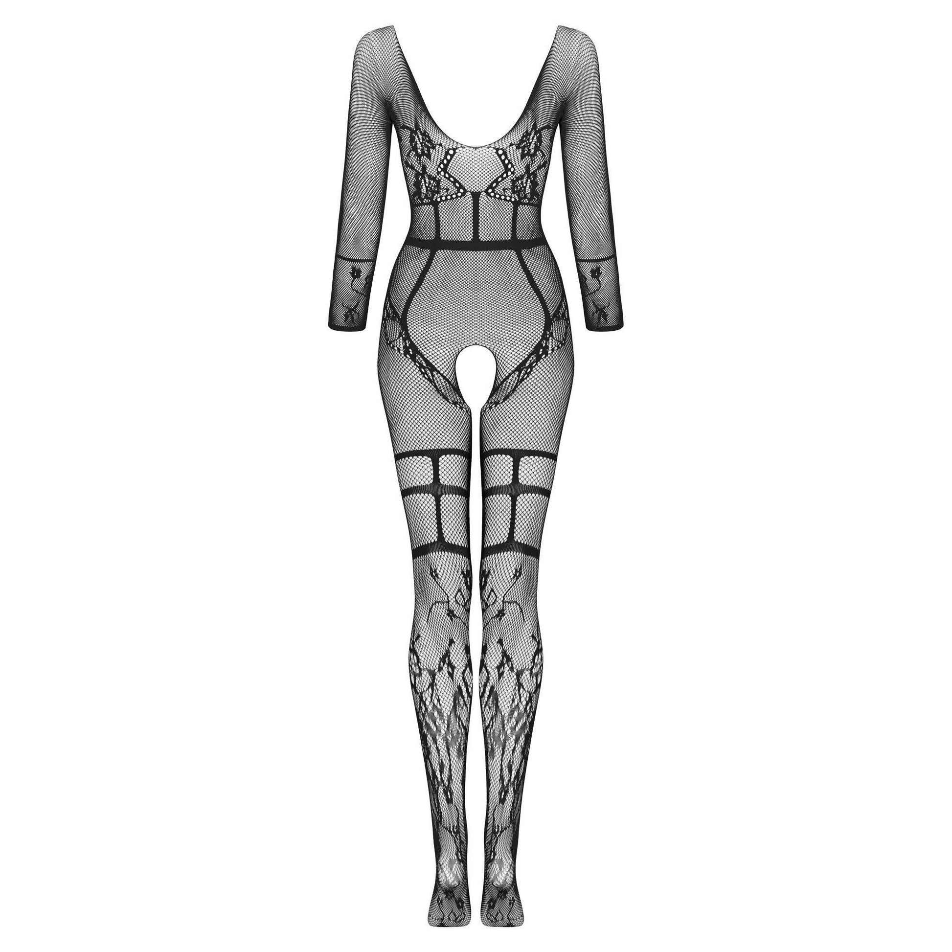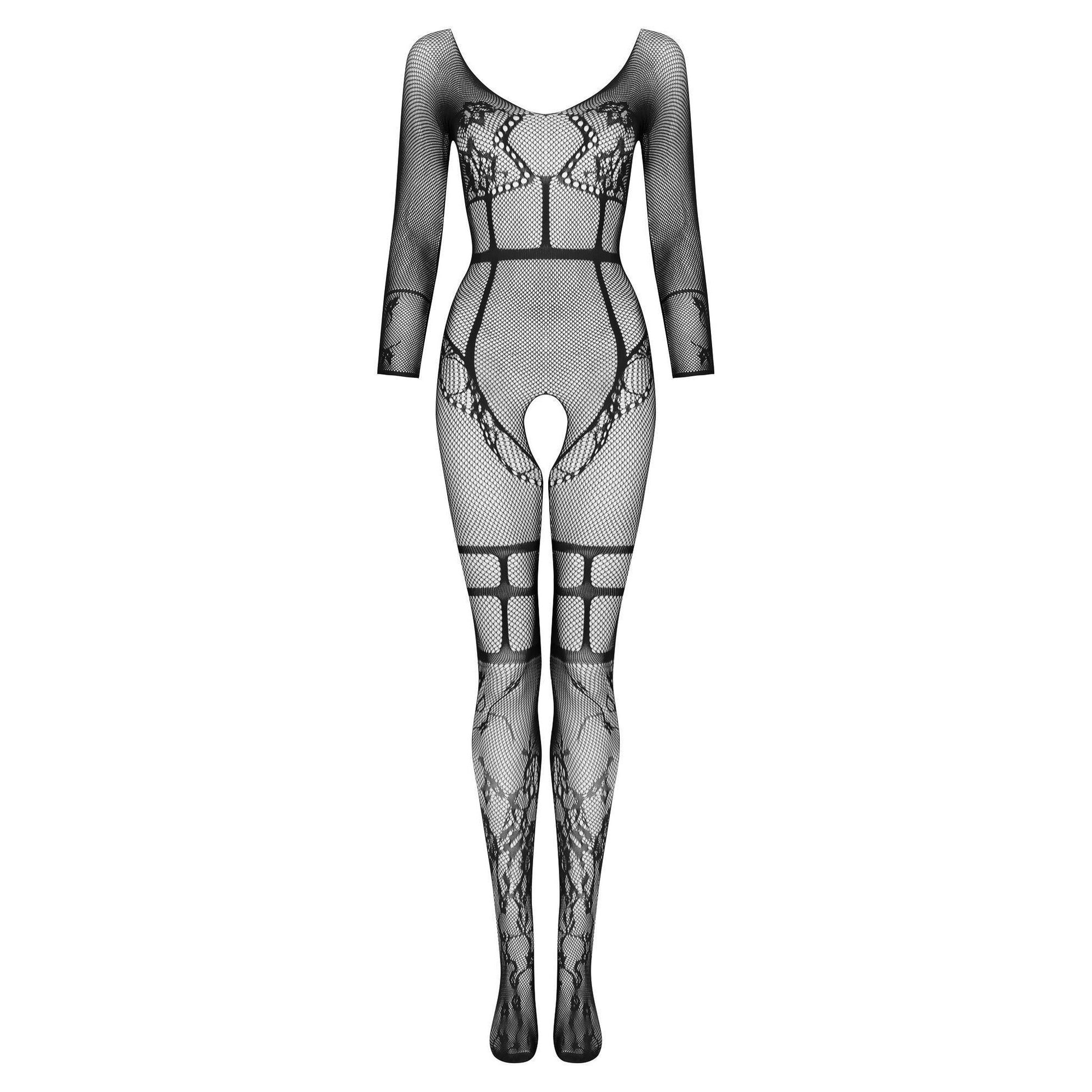 Super sexy bodystocking for lovers of comfortable underwear, made of black, delicate yarn. The fishnet motif is complemented by impressive floral applications and straps at the waist and thighs.Β