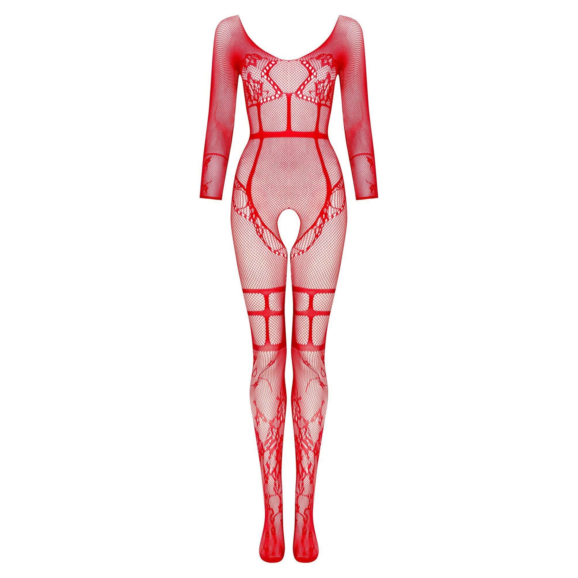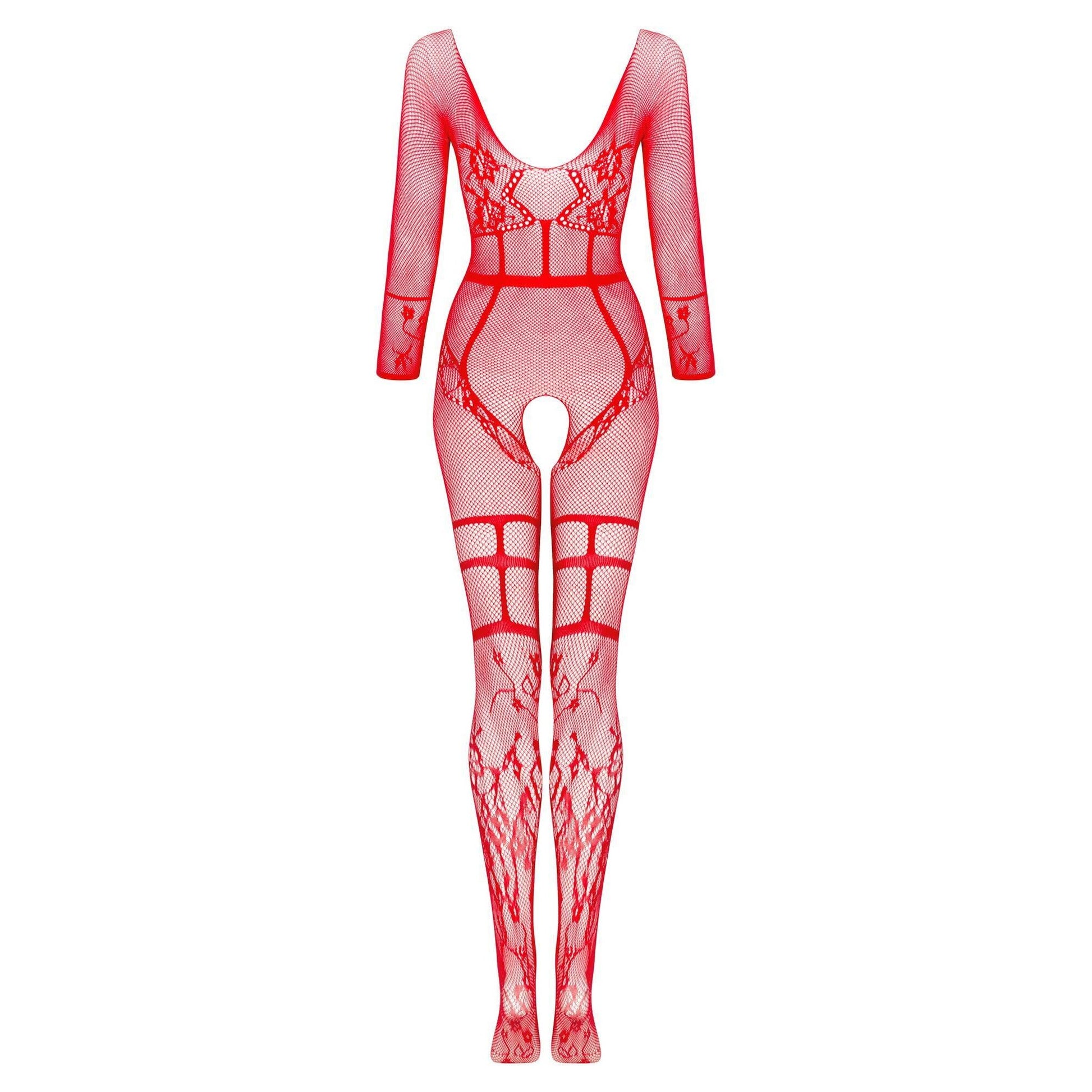 Super sexy bodystocking for lovers of comfortable underwear, made of red, delicate yarn. The fishnet motif is complemented by impressive floral applications and straps at the waist and thighs.