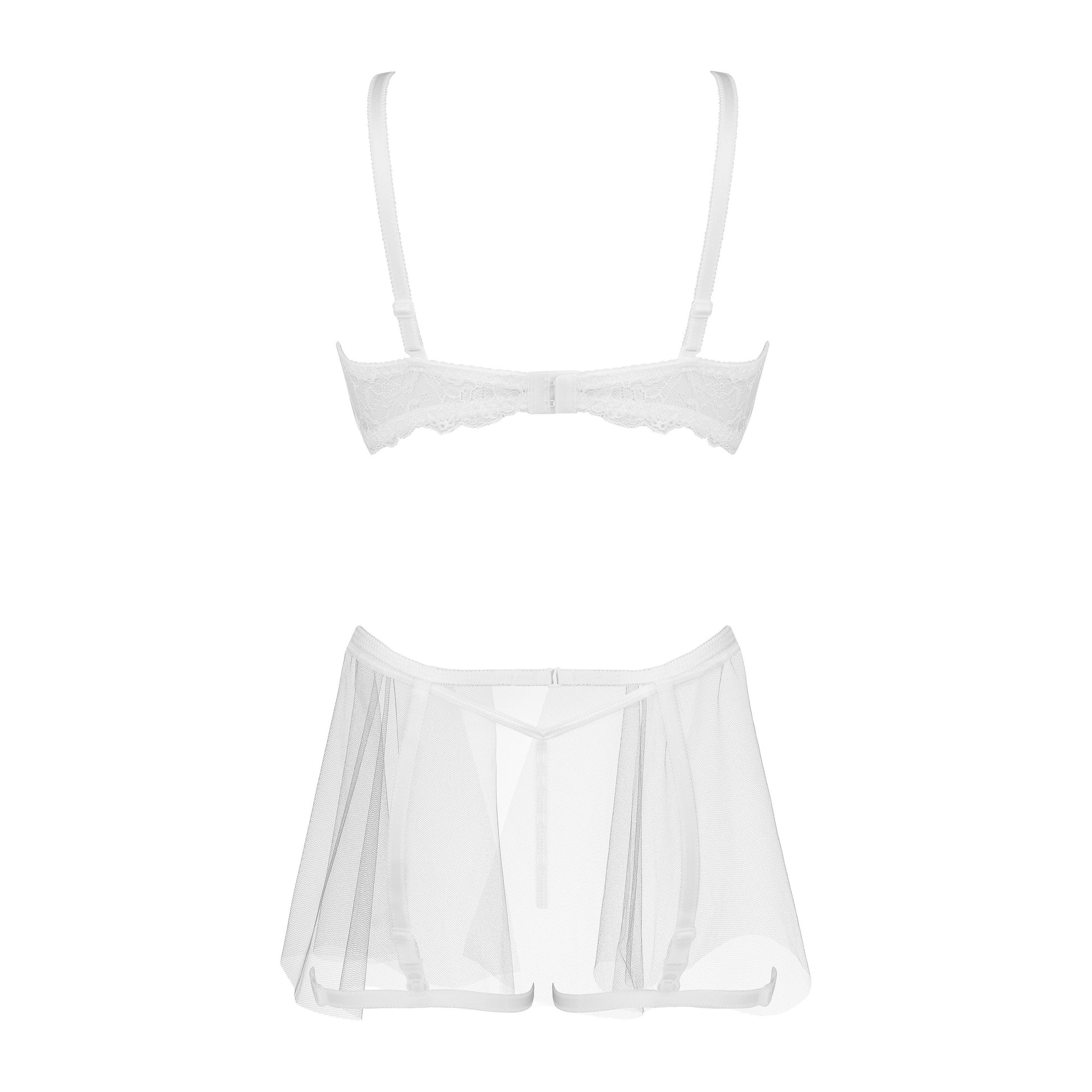 Peony Set White is a delicate lingerie set in a classic white color that captivates with its finesse and elegance. This exceptional set consists of a lace bra, thong, and semi-sheer garter belt.