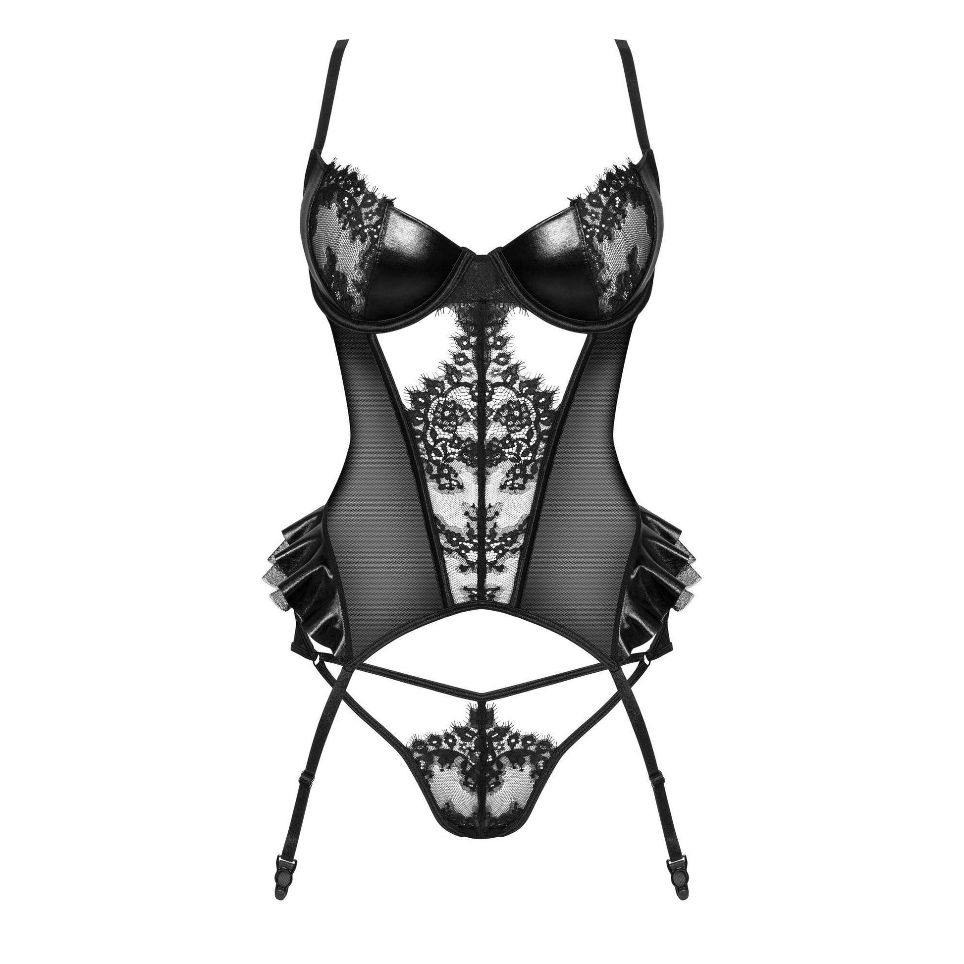 This exceptional Rafaella Corset lingerie set combines elegance and sensual style. Made from lace tulle and wetlook material it beautifully highlights the feminine silhouette boosting confidence. The underwired bra with lace cups accentuates the bust while providing comfort. The sensual corset with subtle cutouts and ruffles at the back accentuates the waist and the adjustable thigh straps complete the seductive design. The set is finished with sensual thongs that harmonize perfectly with the rest of the ensemble.