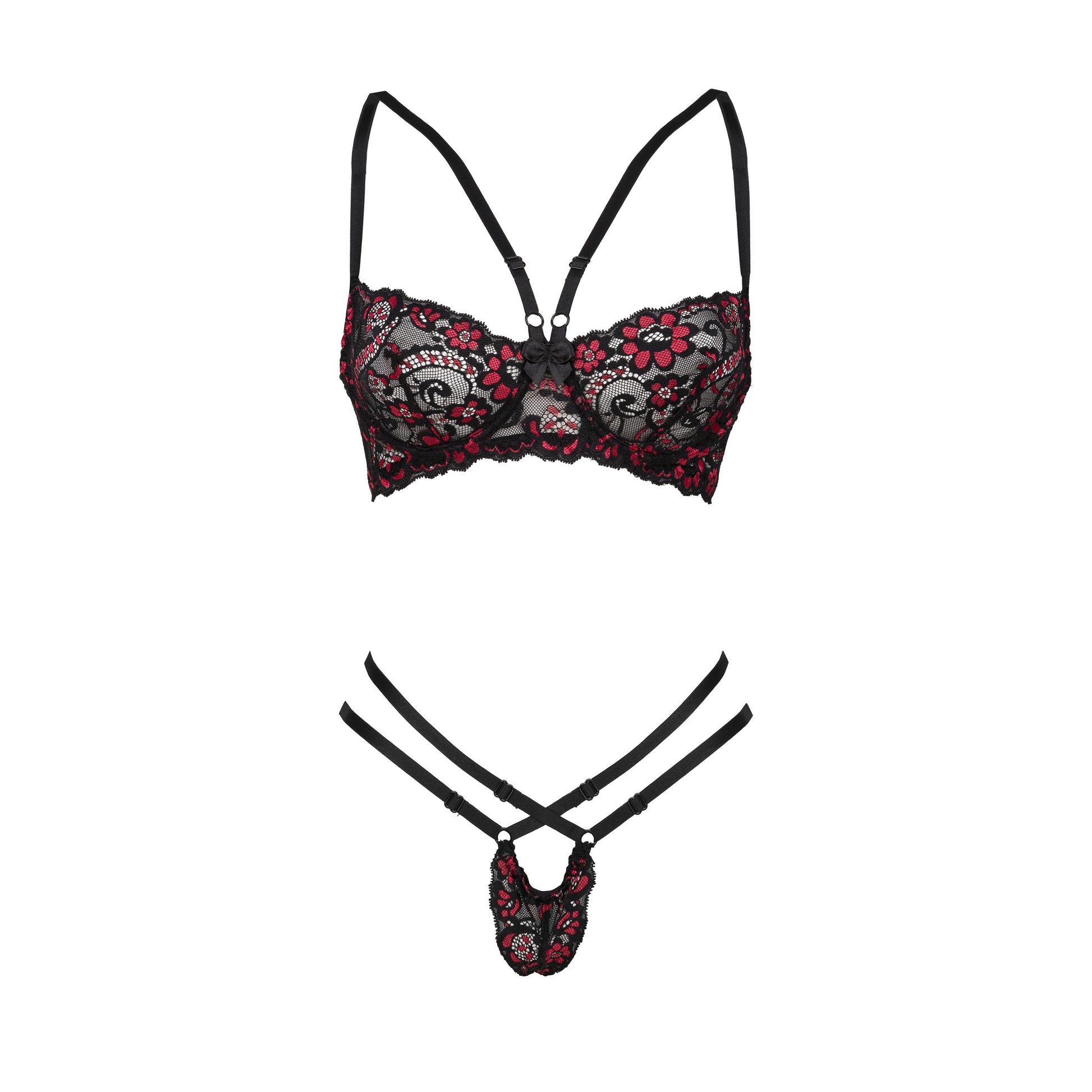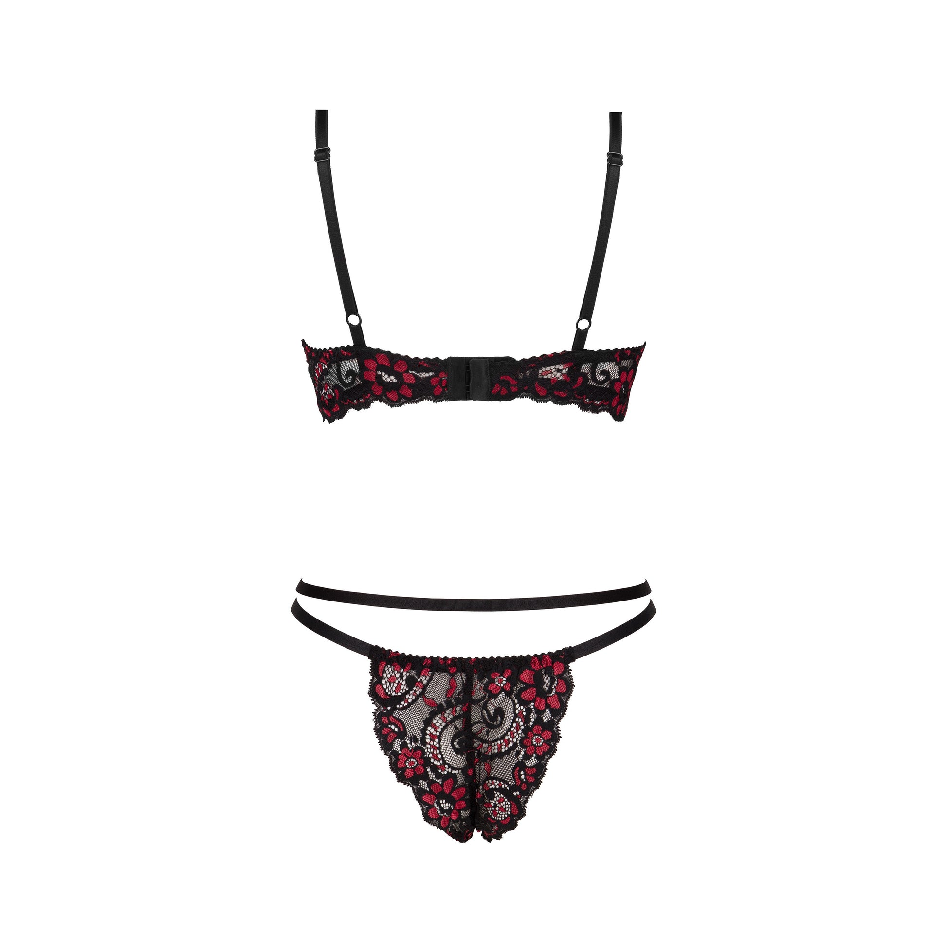 Design: A captivating combination of black lace and bold red floral accents that make a statement.