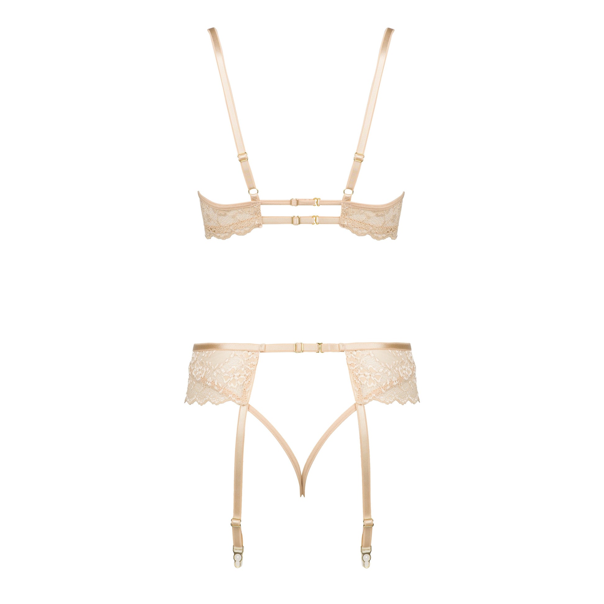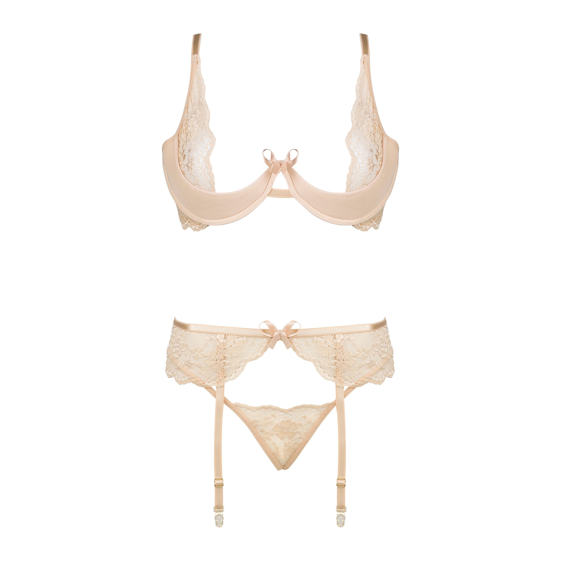 A classic lingerie set in a nude color, consisting of a bra, panties, and a garter belt.