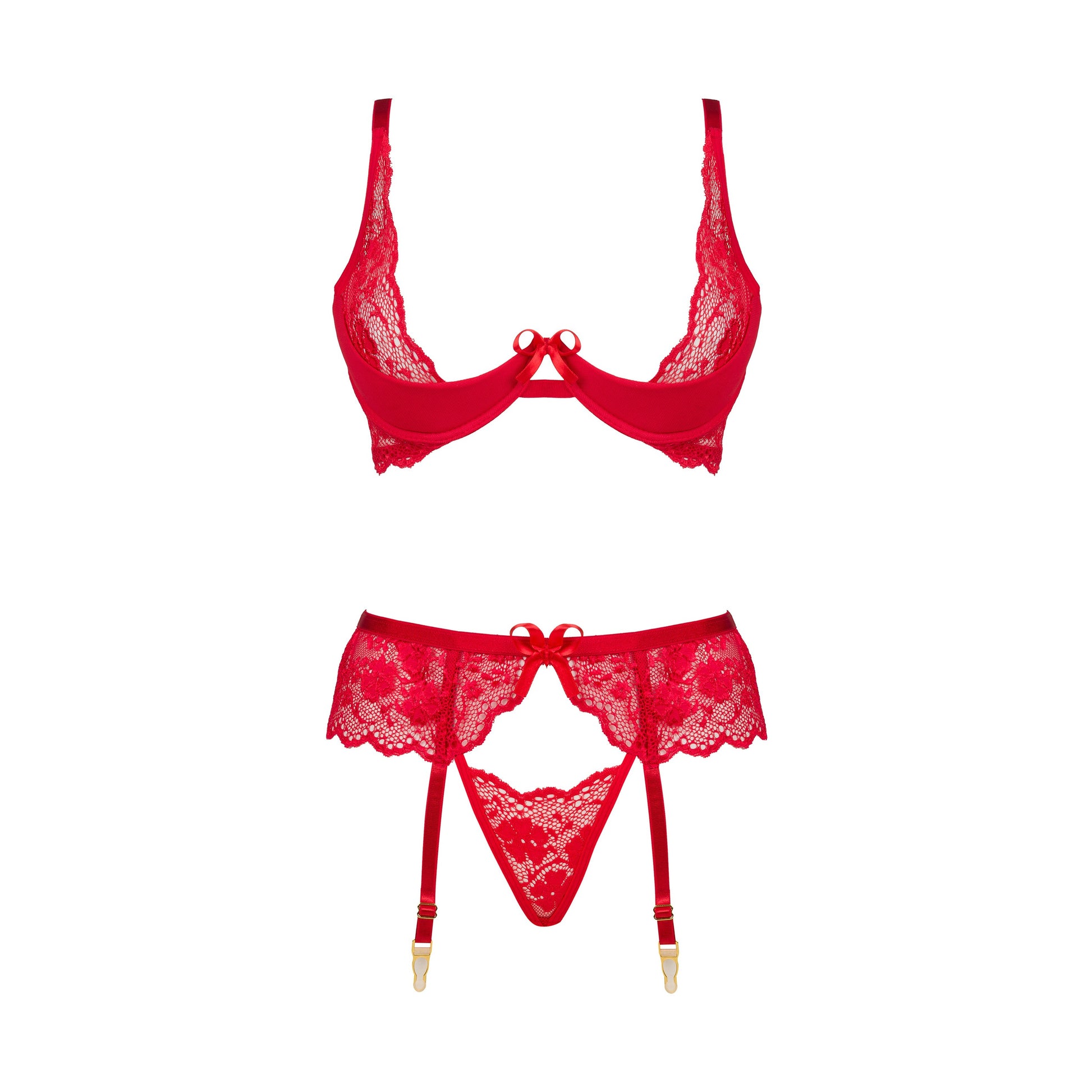 Discover the seductive Rose Set Red lingerie set, featuring a bra, thong, and garter belt. Made from delicate lace in an intense red color, this alluring set enhances your natural beauty and makes you feel incredibly feminine and sexy. Perfect for romantic evenings or as a special gift for a loved one.