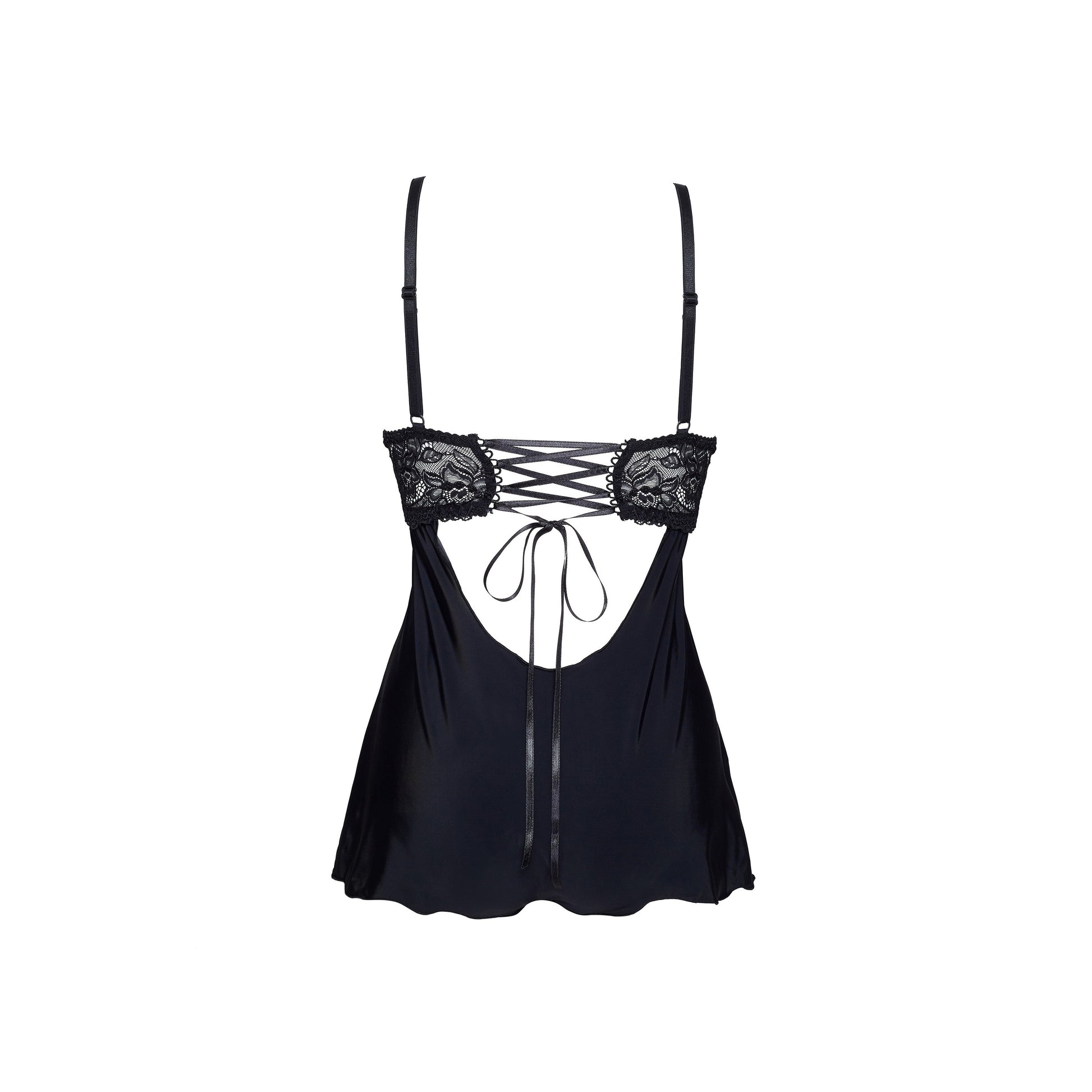 Exclusive but also extremely sexy and sensual teddy made from beautiful, black lace and soft material in the same color. The lace on the bust shows it nicely. Adjustable straps, lacing at the back and hooks in the crotch.