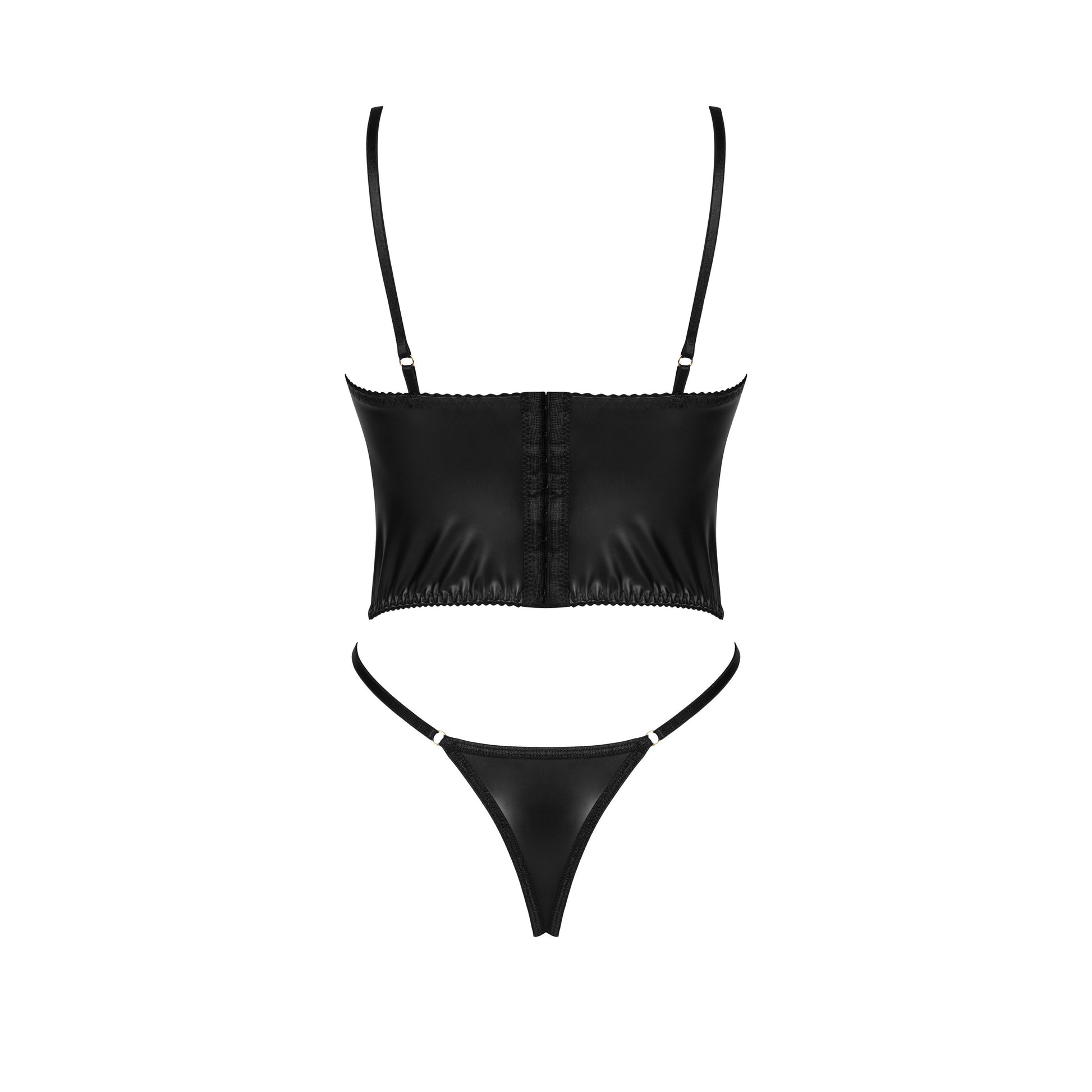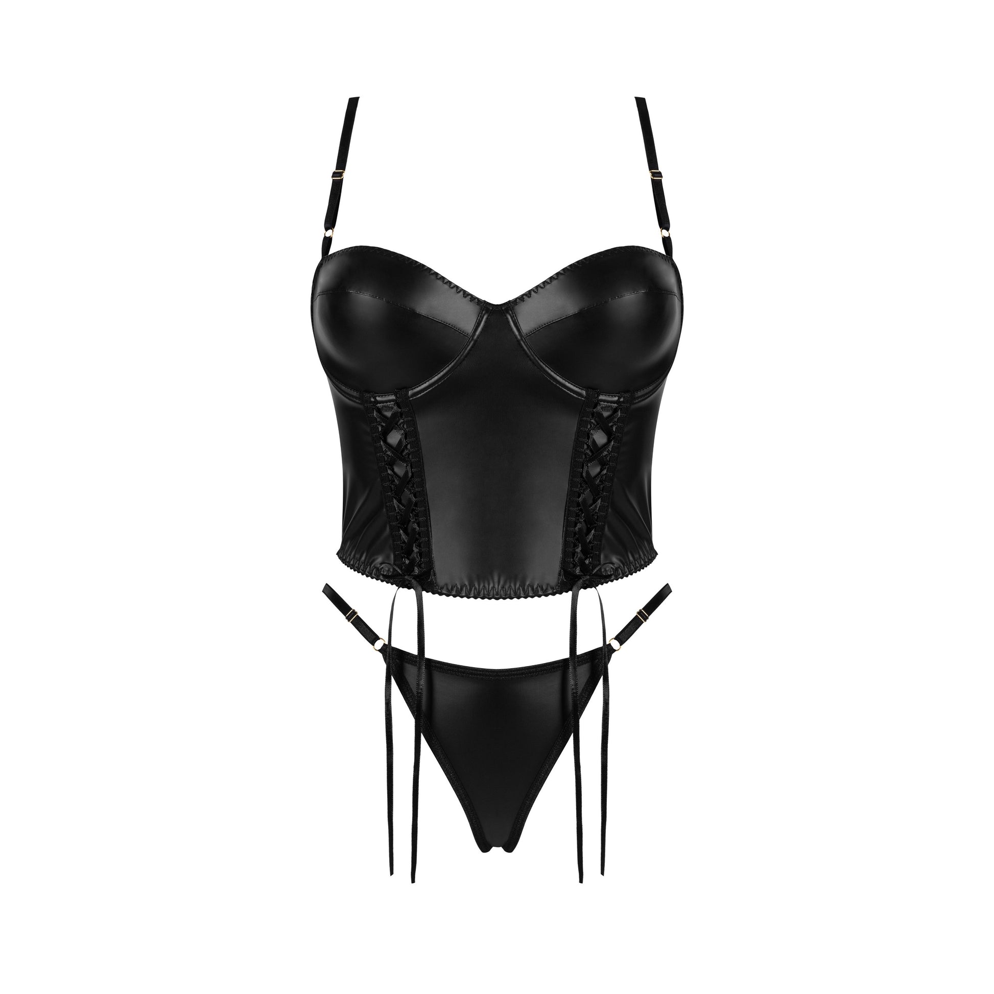A sexy set made of eco-leather in black, perfect for women who want to emphasize their confidence and unique style. The short top - corset with underwire cups provides excellent support for the bust, and the decorative lacing at the front adds a fierce touch to the whole.