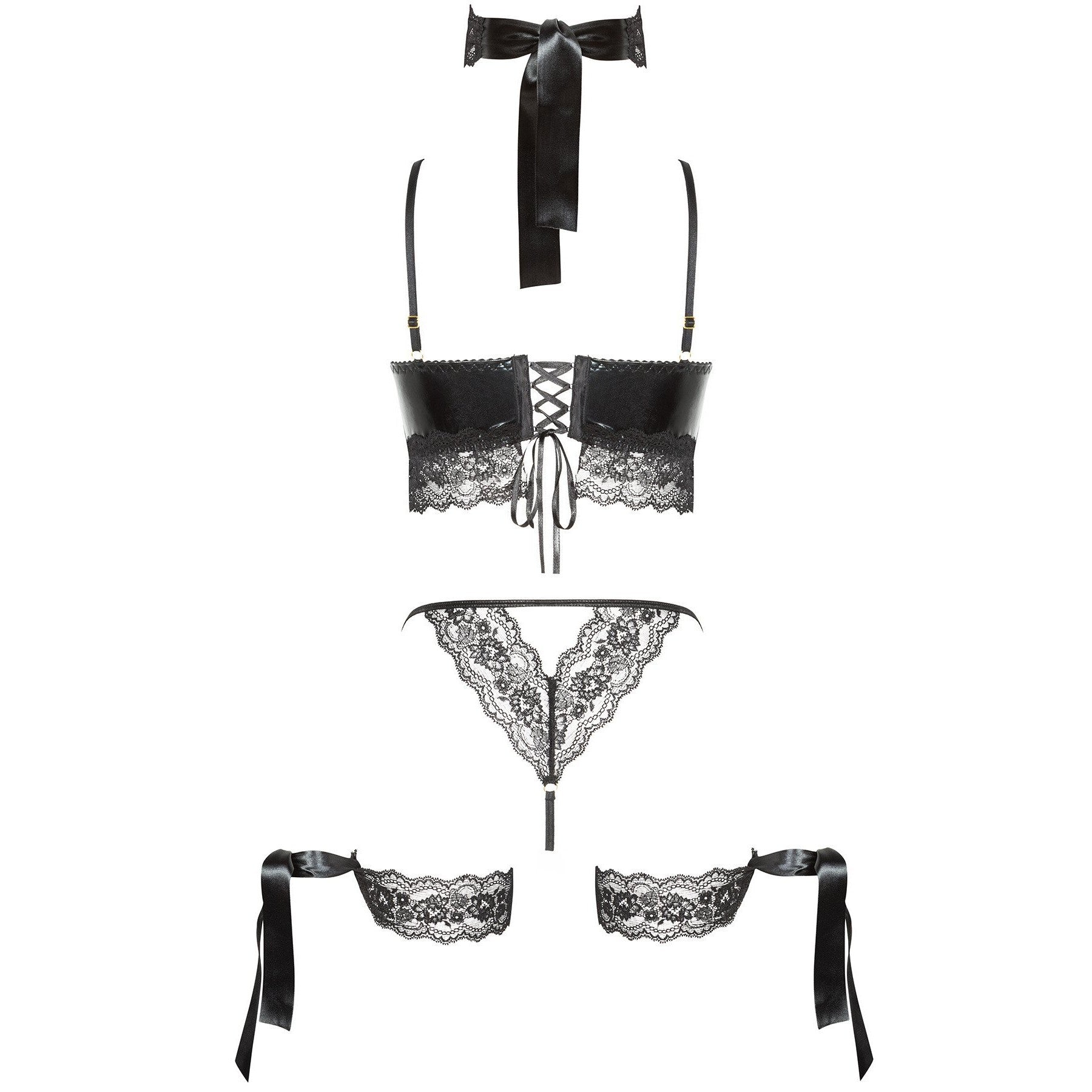 Sexy set consisting of five parts. Original cut of sexy bra made from lace and elastic, glossy material. Back lacing. Complete with thong, eye band and wrist straps.