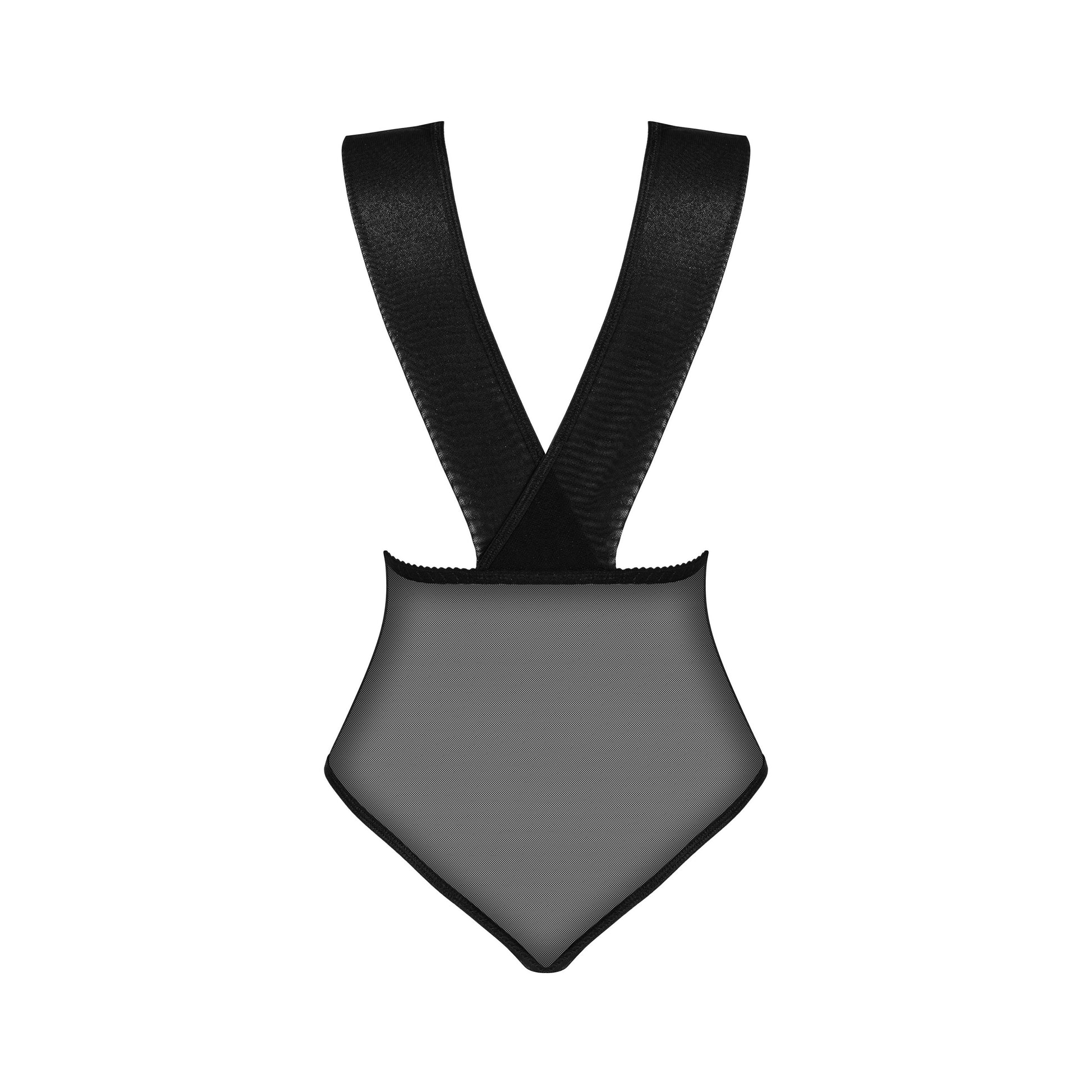 A beautiful, classic teddy in deep black, made of lace and shimmering tulle. The deep neckline and thick, cross-back straps add sophistication.