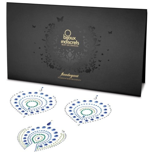 DESCRIPTION: This sophisticated body ornaments by BIJOUX INDISCRETS are inspired by the amazing peacock feathers. They were idealized to turn you into the centre of attention and to enhance all types of bodies. The product has self-adhesive silicone base and it is very easy to apply, so you can feel the sexiest and refined person ever. Dare to use it in any part of your body and you’ll shine like a diamond. -Meant for single use.